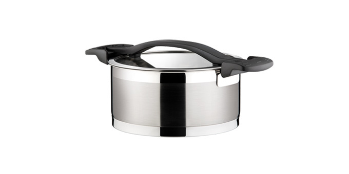 Luxusní kuchyňské nádobí s revolučním systémem regulace páry a cezení. Unikátní sklonerezová poklice se 3 pracovními polohami: 1. ŽÁDNÝ OTVOR PRO PÁRU pro rychlé dosažení varu a ohřívání pokrmů s úsporou energie, 2. MALÝ OTVOR PRO PÁRU pro komfortní vaření bez překypění a cezení nadrobno krájené zeleniny, 3. VELKÝ OTVOR PRO CEZENÍ brambor, těstovin a pro intenzivní vaření bez překypění. Poklici lze odkládat do úchytů, pára stéká zpět do nádobí. Opatřeno extra silným sendvičovým dnem, stupnicí pro snadné odměřování a úchyty z odolného plastu. Vyrobeno z prvotřídní nerezavějící oceli 18/10, vhodné pro všechny typy sporáků - plynové, elektrické, sklokeramické a indukční, vhodné do myčky. 5 roků záruka.