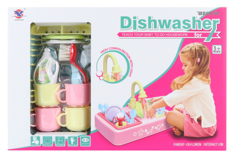 Plastový dřez na baterie, ty slouží k pohonu motorku, který čerpá vodu z nádobky. Voda pak vyteče kohoutkem do dřezu. Napájení na 3 AA baterie (nejsou součástí). Součástí je také nádobí. Rozměr balení cca 42 x 27,5 x 12 cm. Věk 3+ číst celé