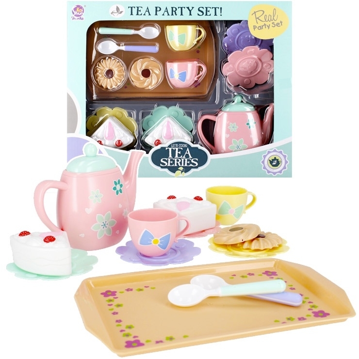 Obsah soupravy: velká konvice, 2x šálek, 4x talíř, 2x čajová lžička, 2x sušenka, 2x dort, 1x tácek. Vše je vyrobeno z plastu. Všechny produkty jsou napodobeninou skutečných věcí!