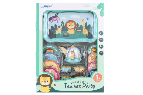 Plechový čajový set. Balení obsahuje konvičku, tác, 4 hrnečky, 4 podšálky a 4 talířky. Rozměry balení cca 30,5 x 40,5 x 9 cm. Věk 3+ číst celé