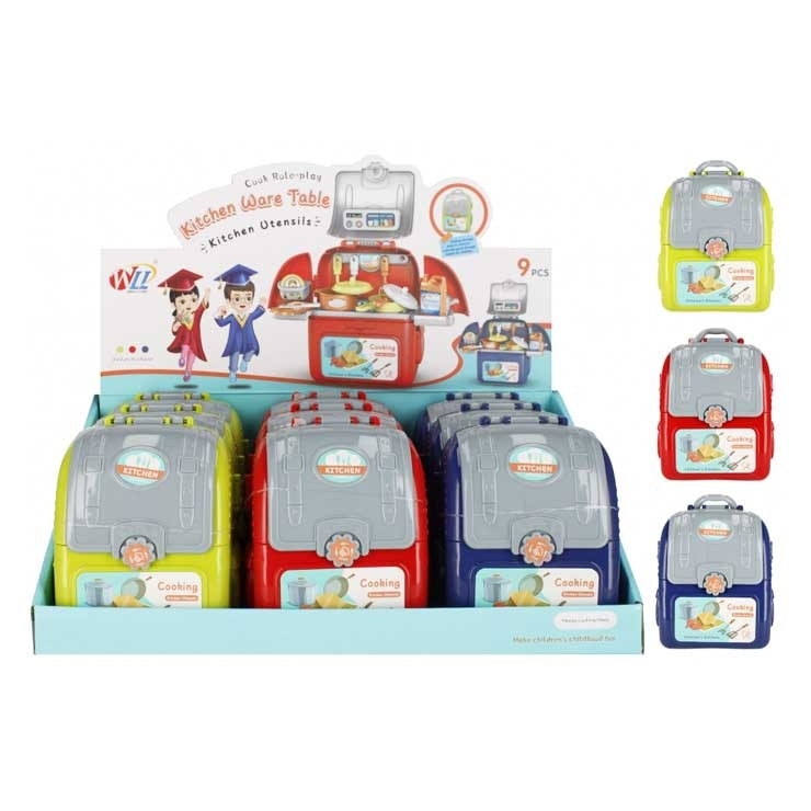 Kuchyňka v batohu, souprava je dostupná ve třech barvách zelená, červená a námořnická modrá. Její obsah je batoh, sporák s dřezem, pánev, naběračka, nůž, hrnec s poklicí, 2x naběračka těstovin, lžíce, talíř, prkénko na krájení, nádoba s tekutinou na čištění hrnců. Rozměry produktu jsou 21x23x7cm. Baleno po 9 kusech. Cena je za 1 kus. Souprava je určena pro děti ve věku 3+.