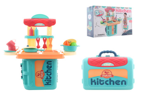 Krásná sada pro malé kuchaře nebo kuchařky. Sad lze používat jako kufřík, nízkou kuchyňku nebo větší kuchyň. Sada obsahuje spoustu propracovaných doplňků jako např. nádobí nebo potraviny. Materiál plast. Baleno v krabici. Rozměry balení cca 27x22x11 cm. Rozměry rozložené větší kuchně cca...