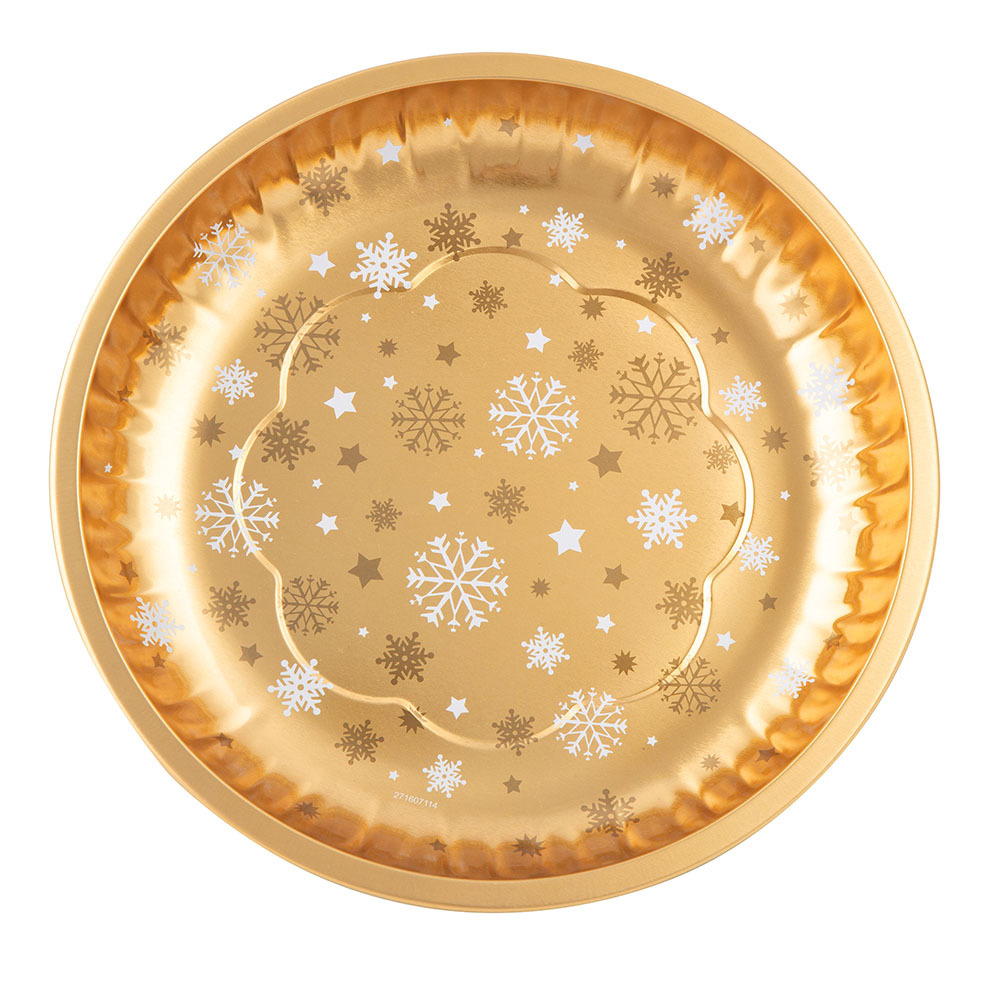 KRUHOVÝ PODNOS PRŮMĚR 26CM OZDOBENÝ ZLATÝMI SNĚHOVÝMI VLOČKAMI