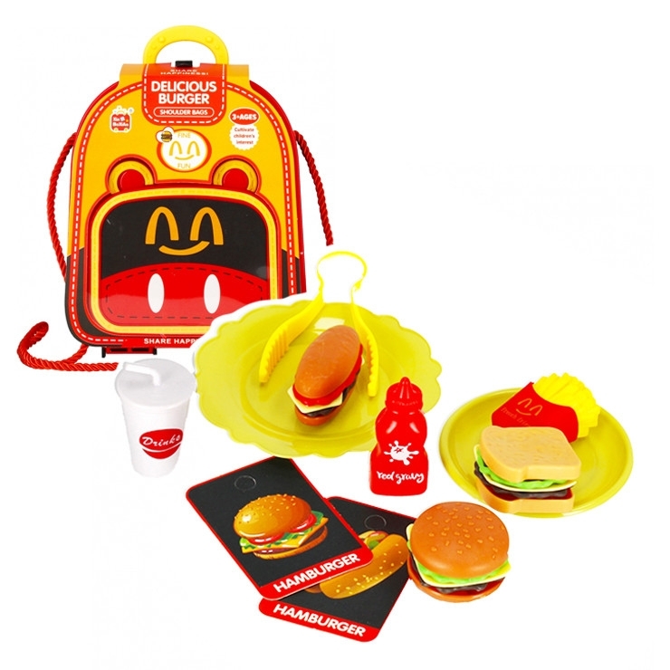 Kuchyňský set v tašce, má rozměr 17x20x9cm. Sada obsahuje tašku, 1x velký talíř, 1x malý talíř, sklenici s nápojem, kečup, hranolky, hot dog, hamburger, sendvič, kleště. Cena je za 1 sadu. Vhodné pro děti 3+.