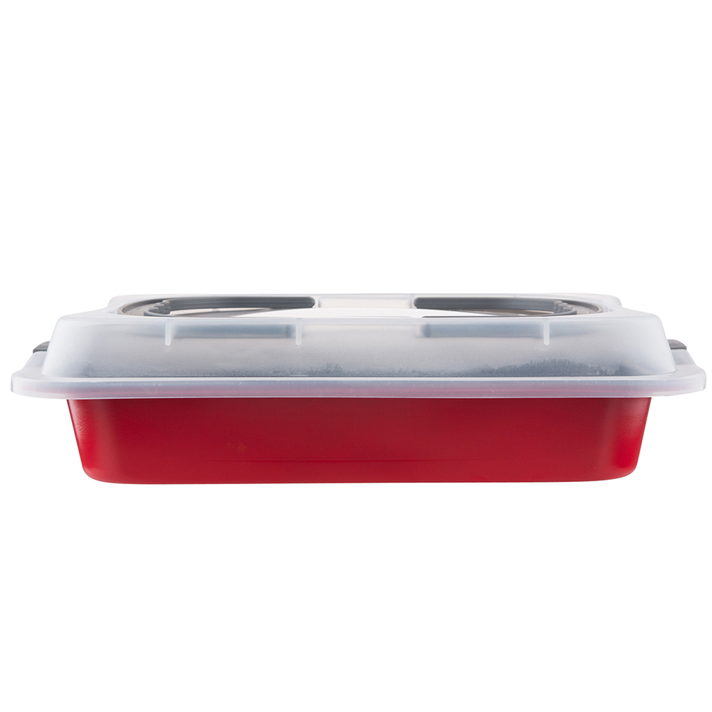 ČERVENÁ OBDELNÍKOVÁ FORMA NA PEČENÍ 36.3X24.5XVÝŠKA 5.5CM S PLASTICKÝM KRYTEM A DRŽÁKEM