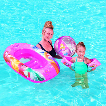 Plážová sada v tašce obsahuje nafukovací míč, plovací rukávky a nafukovací člun. Taška i obsah je v oblíbeném designu Disney Princess.