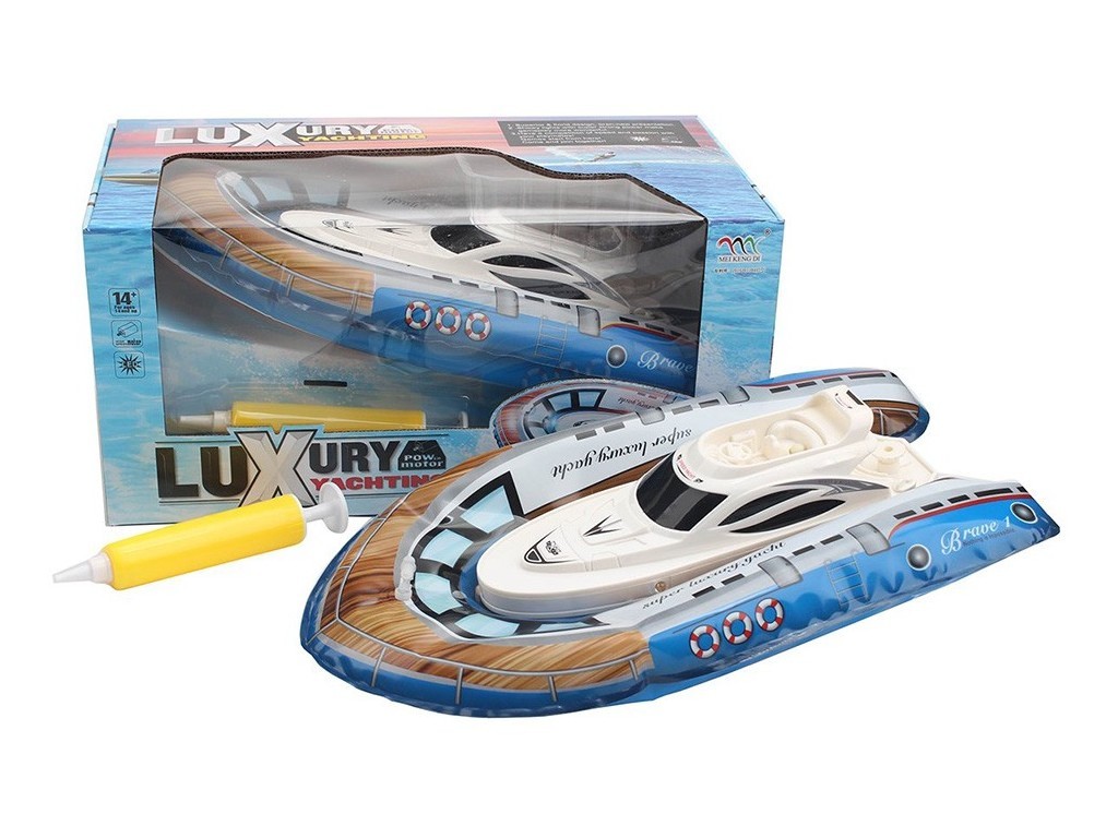 Skvělá loď na plavbu v bazénu nebo na rybníku. Trup lodi se nafoukne přiloženou pumpičkou a může se vyplout. Loď má nastavitelné kormidlo, takže se k vám vždycky v kruhu vrátí. Rozměry lodě 35 x 18 cm. Napájení 3 x 1,5 V AA (tužkové baterie, nejsou součástí). Obsah balení: jedna loď, vzduchová pumpička. Rozměr boxu 38 x 11 x 20 cm. Vhodné pro děti od 3 let.