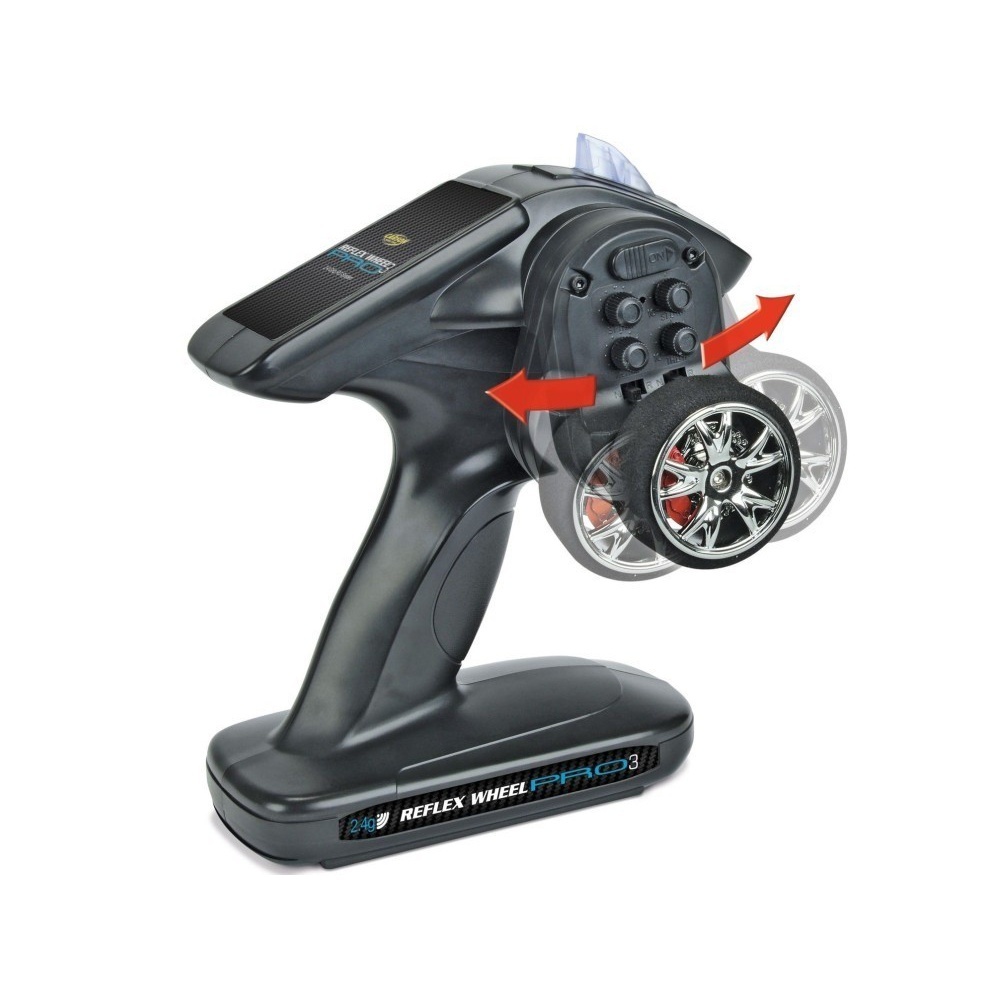 Proporcionální ovládání a Dual-rate výchylky umožňují, aby byl každý model velmi citlivě řízen. Kromě toho může být plyn pro začátečníky a děti omezený. Chromový volant s pěnovou gumovou uchopovací plochou umožňuje přesné ovládání. Integrovaná funkce automatického zastavení Fail-safe v přijímači je záchranný systém pro váš model. Tento systém dálkového ovládání je ideální pro všechny oblasti RC-Car modelů.
