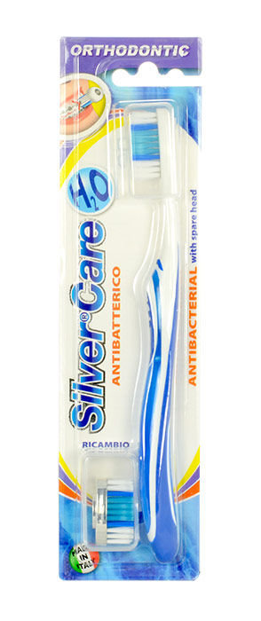 **SilverCare H2O Antibacterial Toothbrush Orthodontic** zubní kartáček ortodontický. **Obsah:** **H2O Antibacterial 1x - Kartáček ortodontický** Ortodontický zubní kartáček s hlavicí pokrytou čistým stříbrem, které má antibakteriální účinky. **Náhradní hlavice 1x**