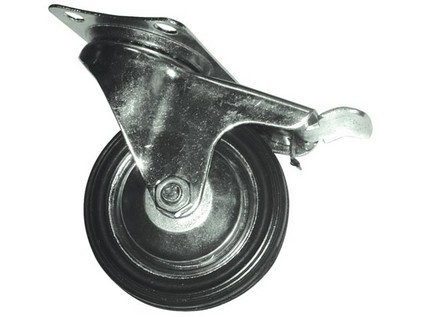Otočné kolečko s brzdou, které je určeno pro nerovné a tvrdé povrchy, často montováno u kontejnerů na tříděný odpad.
