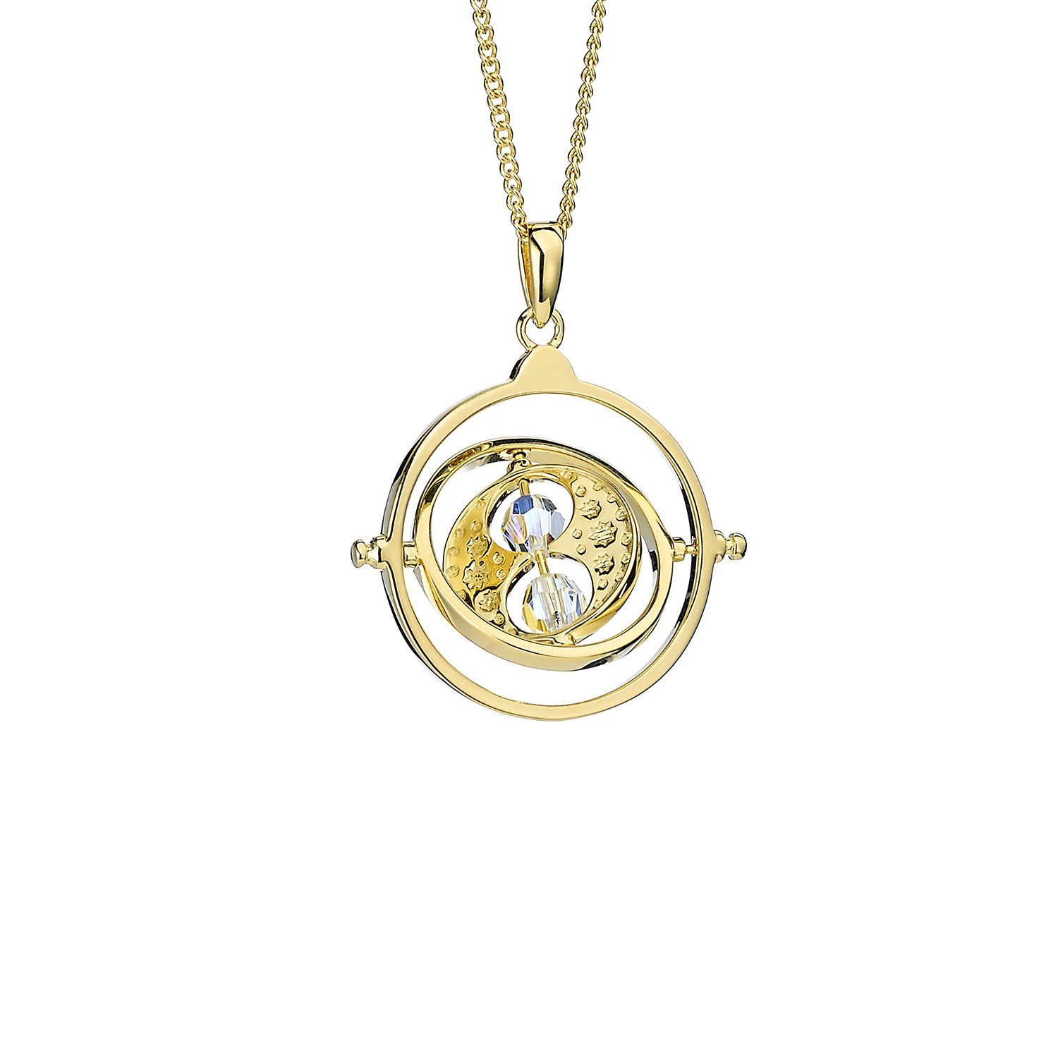 Krásný stříbrný náhrdelník, pozlacený a osazený krystaly, má podobu Obraceče času, který užívala Hermiona Grangerová v příbězích o Harry Potterovi. Jedinečný šperk pro fanoušky magického světa J. K. Rowlingové! Řetízek je dlouhý 40 cm s možností rodloužení o 5 cm. Přívěsek je široký 2,5 cm. Dodáváno v dárkové krabičce.