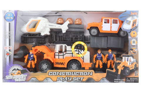 Velká stavební sada na baterie. Balení obsahuje helikoptéru, terénní auto, nakladač na baterie, 3 firgurky a další doplňky. Nakladač vydává zvuky a svítí. Napájení na 2 AG13 baterie (jsou součástí). Rozměry balení cca 58,5 x 31 x 12 cm. Věk 3+ číst celé