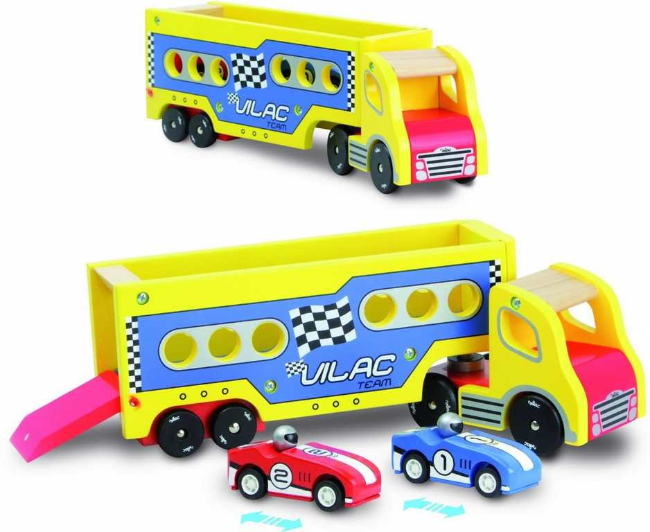 Dvě retro závodní auta jsou připravena vjet do přepravního kamionu! Zadní část tohoto dřevěného návěsu je otevíratelná. Vytvoří tak nájezd pro dvě závodní auta a může je přepravit kamkoliv potřebují. Hračky Vilac mají značku francouzské agentury ADEME, to znamená, že tyto dřevěné hračky jsou vyráběny ekologicky. Šetří životní prostředí, neznečišťují půdu, vodu a vzduch, neplýtvají energiemi. Již více než 100 let plní značka Vilac dětské sny. Společnost Vilac sídlí hluboko v srdci pohoří Jura, obklopena horami, jezery a lesy. Tato francouzská společnost vyrábí od roku 1911 dřevěné hračky v klasickém, starodávném stylu s moderními barvami a vzory. Hračky Vilac jsou jedinečné, nikdy nevyjdou z módy a dokáží okouzlit všechny generace. Vilac pomáhá utvářet dětskou představivost svými radostnými ilustracemi či dizajny a reinterpretací klasických hraček, které se jen tak neopotřebují. Děti dostávají na Vánoce a narozeniny spousty hraček, většina z nich je však nezaujme na dlouhou dobu, láska k hračce se nenaplní. Dřevěné hračky Vilac vzbuzují vášeň i o 50 let později, když jako dospělí náhodou najdete v podkroví hračky, které jste jako děti milovali. Vilac již 100 let propojuje děti s hračkami, které si oblíbí a váží si jich. A proč je děti tak milují? To zůstává tajemstvím firmy Vilac.