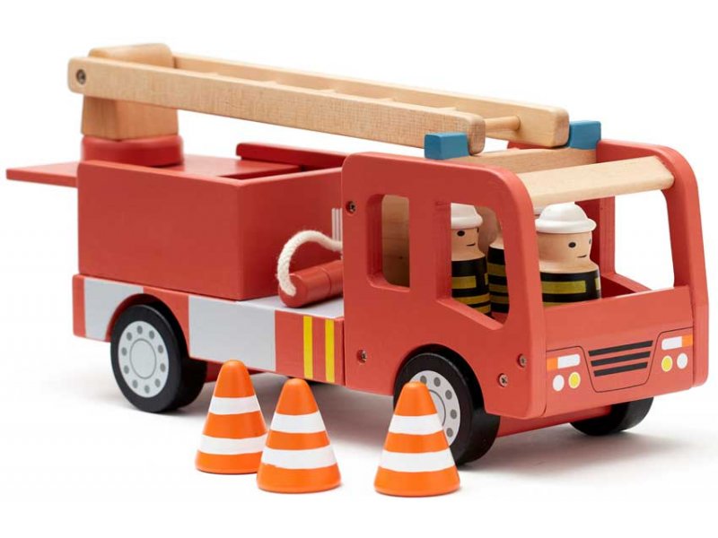 Dřevěný hasičský vůz v krásném designu s třemi postavičkami hasičů. Hasiči jsou vždy připraveni zastavit požáry v Aiden City. Žebřík lze otáčet vodorovně i svisle. Požární hadici lze připevnit k vnějšímu okraji žebříku. Pomocí tří kuželů zablokujete silnici, aby kolem neprojížděla žádná auta, která by rušila hasiče v jejich důležité práci. Během jízdy mohou být kužely uloženy uvnitř vozíku.