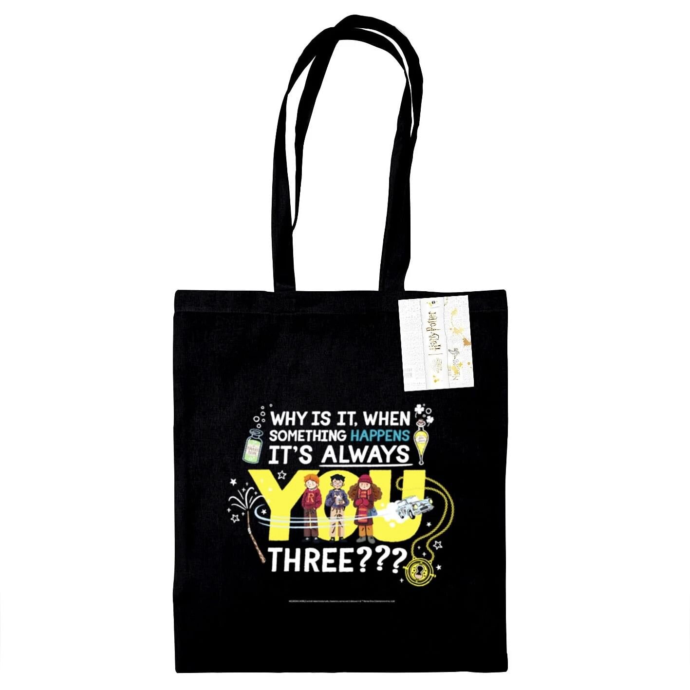 S černou nákupní taškou pro milovníky světa Harryho Pottera budeš mít trojici věrných kamarádů z Bradavic vždy při sobě, ať už se chystáš do obchodu pro novou kouzelnickou hůlku nebo na dobrodružný výlet. Tašku zdobí kreslené postavy Harryho, Rona Weasleyho a Hermiony Grangerové, spolu s citátem profesorky McGonagallové v angličtině: Proč vždy, když se něco stane, u toho musíte být vy tři? Nechybí ani detaily připomínající dobrozdružství a neplechy, které spolu mladí kouzelnící prožili.