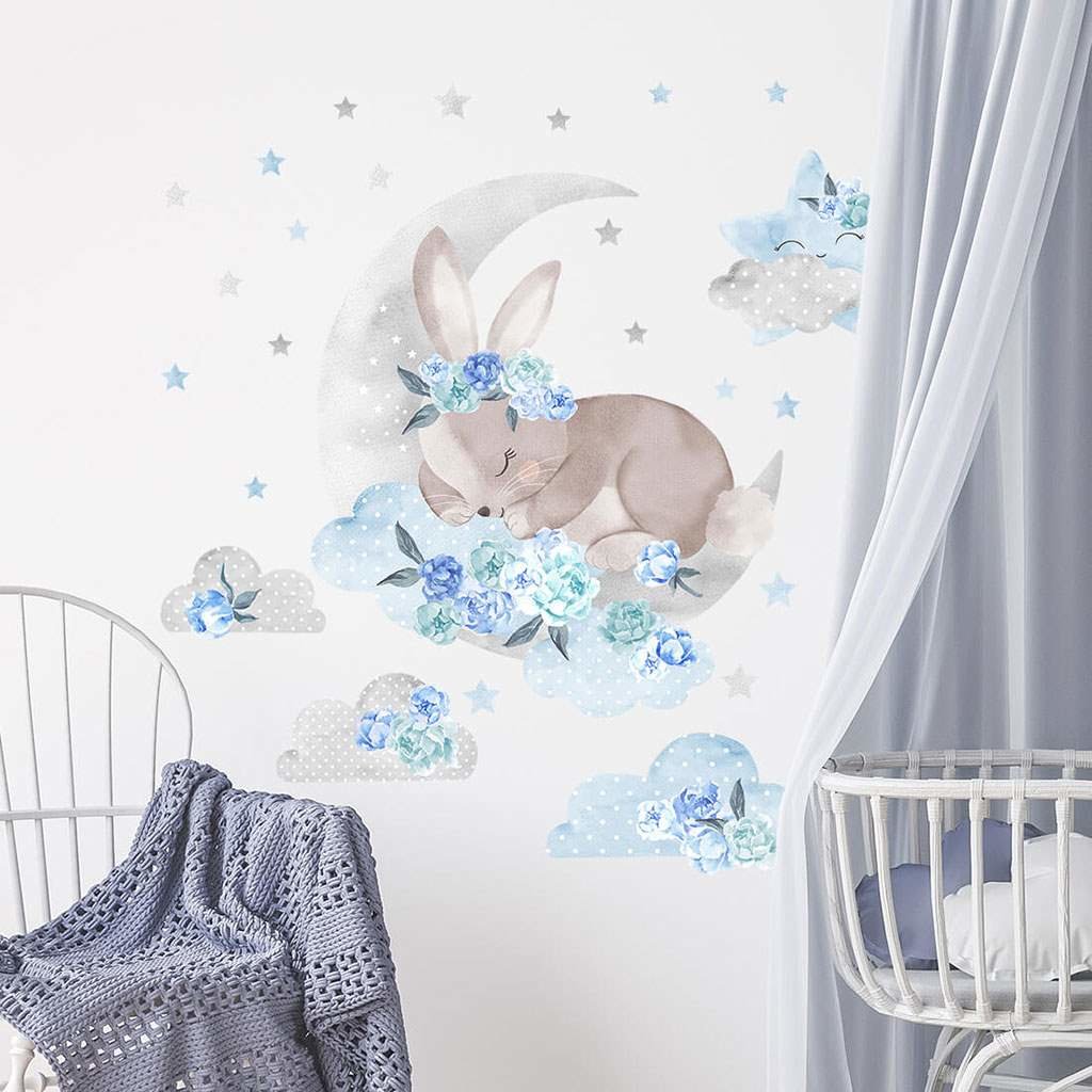 Krásná nálepka na zeď Spící králík. Nálepka Modrý spící králík je součástí kolekce pivoněk, která byla vytvořena pro všechny příznivce květinových motivů a lesních zvířat. Způsob vzniku je netypický: v první etapě byly zhotoveny skici celé kolekce, v další etapě namalovány akvarelovou barvou na speciální papír a v samotném závěru byly pomocí výpočetní techniky připraveny tiskové materiály. Tento pokročilý proces učinil celou kolekci jedinečnou v každém ohledu. Samolepka je zajištěna speciálním matným laminátem, který ji chrání před poškrábáním při každodenním používání a zároveň usnadňuje lepení - fólie je silnější a snáze se přenáší na zeď. Rozmístění jednotlivých částí na zeď je možné dle vaší fantazie. Pokud hledáte dokonalý způsob, jak oživit dětský pokojíček, naše samolepky na zeď jsou tou správnou volbou. Objednejte si je ještě dnes a udělejte radost svému dítěti.