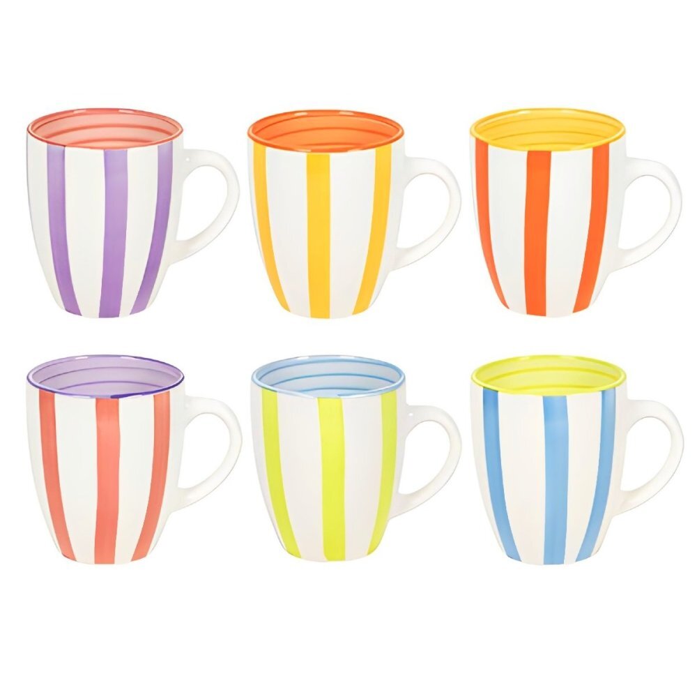 Keramická souprava hrnků SUMMER - 6 x hrnek na kávu i čaj.Tato sada obsahuje šest hrnků o objemu 350 ml, všechny v bílém provedení s různými pastelově barevnými pruhy. Vnitřek šálků je barevně glazovaný. Stylové barvy a jedinečný design této sady dodají každému vašemu kávovému nebo čajovému rituálu nádech pohody. Sada je vyrobena z kvalitní keramiky, která je odolná a snadno se čistí. Perfektně se hodí jak na každodenní použití, tak i pro speciální návštěvy. Sada krásných hrnků je také perfektním dárkem ke každé příležitosti. Vhodné do mikrovlnné trouby, do myčky nádobí i do lednice.Sada obsahuje 6 šálků.