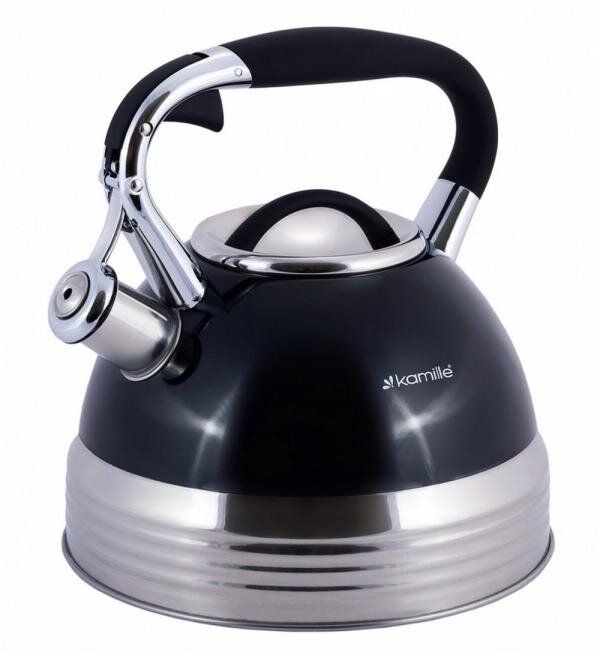 Varná konvice z nerezové oceli s píšťalou o objemu 2,7l a bakelitovou rukojetí.