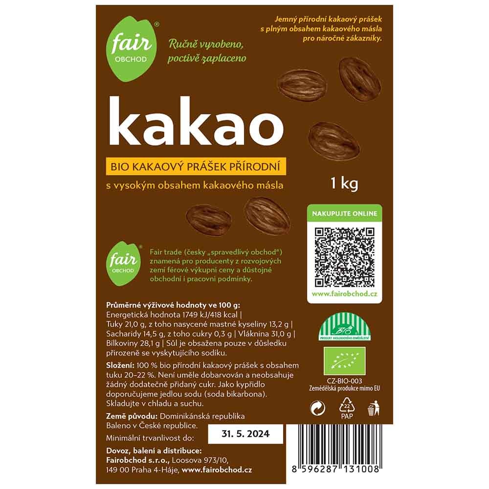 Fairobchod Bio kakaový prášek plnotučný přírodní z Dominikánské republiky, 1 kg