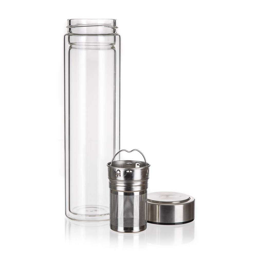 Láhev se sítkem DOBLO 500 ml je vyrobena z borosilikátového skla, které je odolné proti vysokým teplotám. Díky dvoustěnnému provedení nepřenáší teplotu nápoje na povrch láhve a nápoj vydrží déle teplý nebo studený. Láhev obsahuje odnímatelné sítko z nerezové oceli, díky kterému si můžete vychutnat sypaný čaj či vodu s ovocnou příchutí. Láhev se uzavírá víčkem z nerezové oceli 18/8.