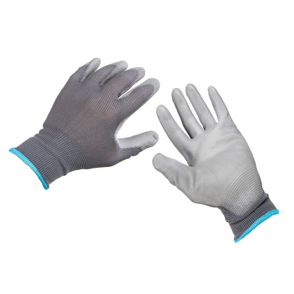 Pracovní bezešvé pletené rukavice v šedé barvě, potažené šedým PU od dlaně k prstu. Rukavice splňují normy EN 420:2003+A1:2009 a EN 388:2016. Osobní ochranný prostředek kategorie II. Rukavice jsou určeny k ochraně proti mechanickým rizikům v suchém prostředí. Jsou určeny zejména pro stavebnictví, strojírenský průmysl, sklady, zemědělství apod. Velikost M/8.
