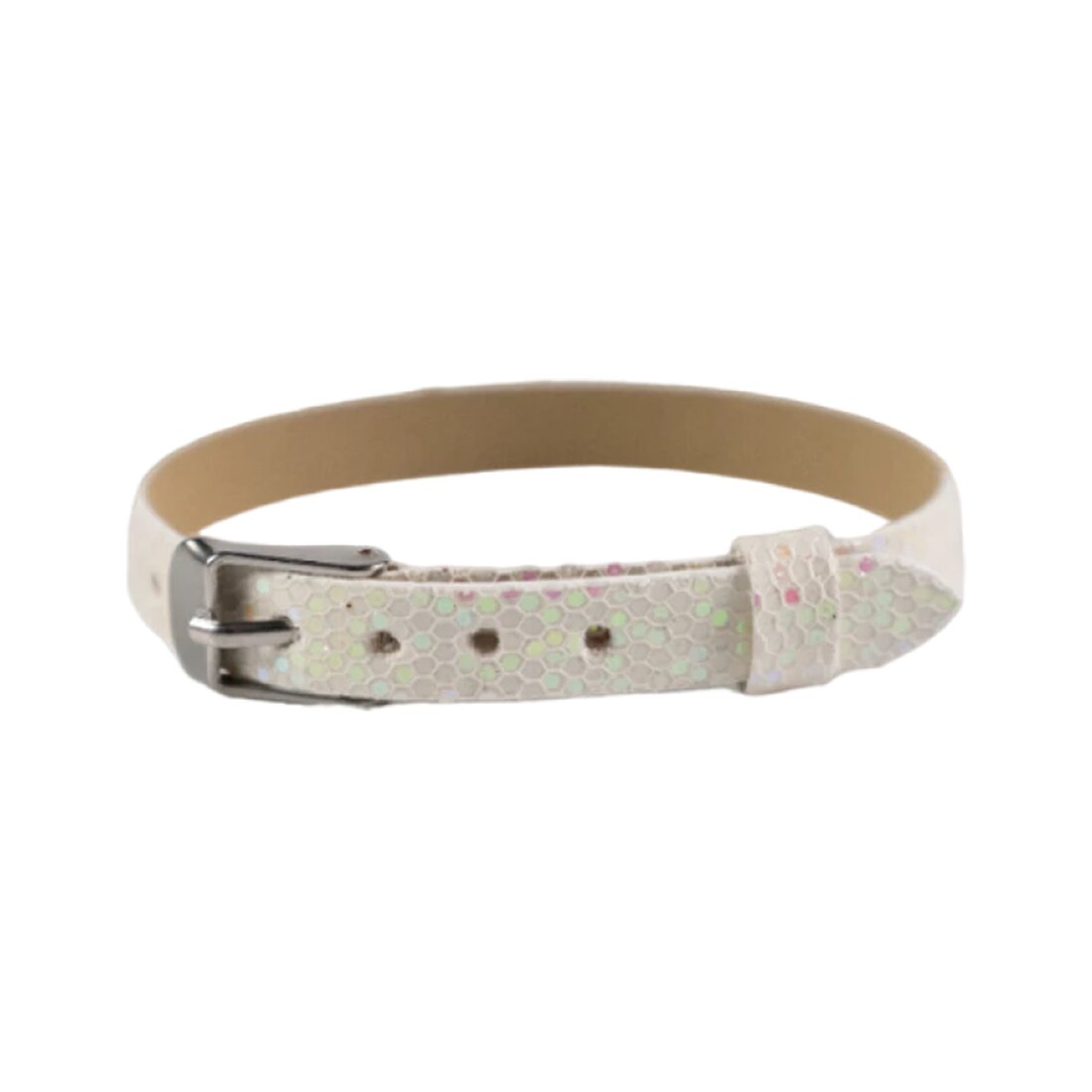 Biely detský náramok DISCO švédskej značky Nojomojo umožní každému dieťaťu stať sa návrhárom! Náramok má vzhľad kože, je dlhý 22 cm, zapína sa na pracku a vďaka 7 dierkam je pripravený na ďalšie zdobenie. Deti si ho môžu vyzdobiť písmenkami a ozdobami rovnakej značky a vytvoriť z neho personalizovaný náramok s menom.