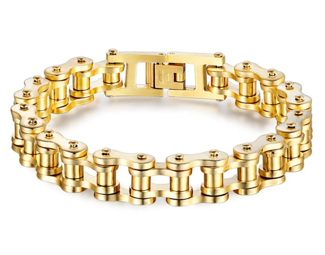 Ocelový náramek v lesklém provedení ve stylu motocyklového řetězu.Tento šperk s důmyslným navržením působí stylově a osloví každého muže, který má rád netradiční doplňky.