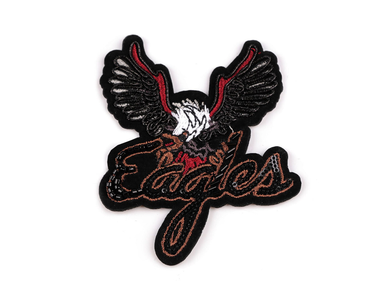 Vyšívanou textilní aplikaci zdobí flitry a korálky. Na vašem vašem outfitu vykouzlí poutavý detail. Vynikne na mikině, riflové bundě, riflích, motorkářských oděvech apod.