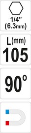 Zakončení magnetickým držákek HEX 1/4" pod úhlem 90° s celkovou délkou 105 mm.