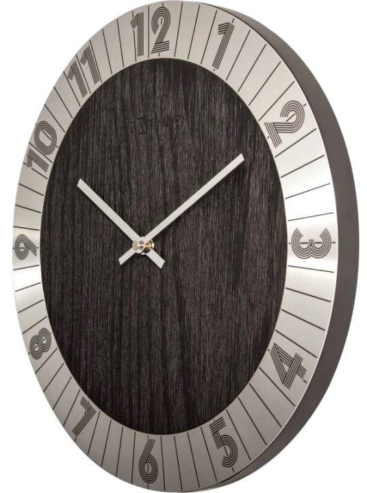 ?Ciferník z černé dýhy v kombinaci se "stříbrným" kovovým rámečkem na ciferníku a kovovými ručičkami.