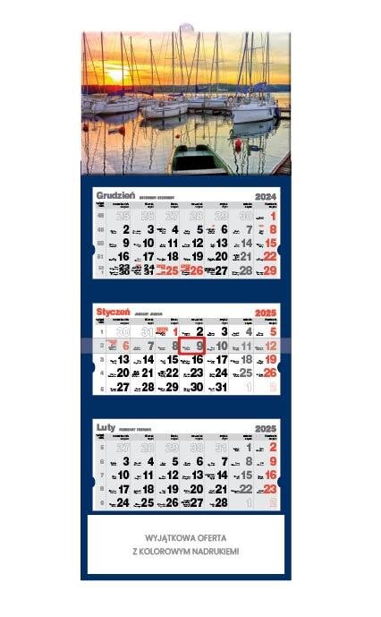 KALENDARZ TRÓJDZIELNY NA 2025 ROK WYMIAR CAŁKOWITY KALENDARZA: 32 x 85,5cm GŁÓWKA KALENDARZA: Zdjęcie uszlachetniane folią błysk, z efektem wypukłości. KALENDARIUM: wym. 28,5 x 14 cm, trójjęzyczne (PL, GB, D), z numeracją tygodni i imieninami jest przytrzymywane przez kartonowe wypustki, które zapobiegają jego odstawaniu od plecków kalendarza. WYKOŃCZENIE: kartonowa zawieszka, pasek z czerwonym przesuwanym okienkiem, miejsce na notatki.