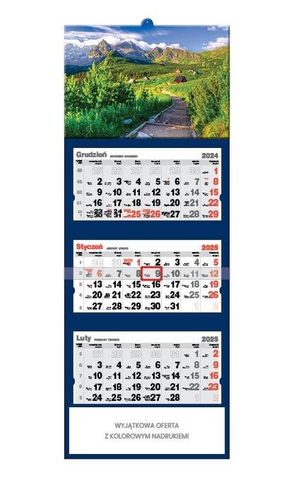KALENDARZ TRÓJDZIELNY NA 2025 ROK WYMIAR CAŁKOWITY KALENDARZA: 32 x 85,5cm GŁÓWKA KALENDARZA: Zdjęcie uszlachetniane folią błysk, z efektem wypukłości. KALENDARIUM: wym. 28,5 x 14 cm, trójjęzyczne (PL, GB, D), z numeracją tygodni i imieninami jest przytrzymywane przez kartonowe wypustki, które zapobiegają jego odstawaniu od plecków kalendarza. WYKOŃCZENIE: kartonowa zawieszka, pasek z czerwonym przesuwanym okienkiem, miejsce na notatki.