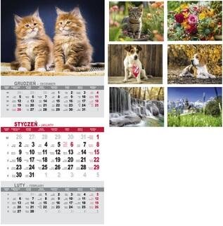 Kalendarz Trójdzielny jest niezastąpionym narzędziem dla każdego, kto pragnie mieć swoje terminy pod pełną kontrolą. Kalendarz został starannie zaprojektowany, by oferować nie tylko pełen przegląd bieżącego miesiąca, ale również umożliwiać łatwe śledzenie poprzednich wydarzeń, dzięki prezentacji trzech miesięcy na jednej stronie - bieżącego i dwóch poprzednich (Układ kalendarium: 3 miesiące - 1 kartka). Przesuwane okienko umożliwia intuicyjne zaznaczanie i śledzenie poszczególnych dni, co czyni go wyjątkowo praktycznym w codziennym użyciu. Kalendarz jest wyposażony w wytrzymałą dziurkę, która umożliwia proste i bezpieczne zawieszenie go na ścianie, gwarantując, że będzie on zawsze pod ręką i w zasięgu wzroku. Idealnie sprawdzi się zarówno w domowym gabinecie, jak i w dynamicznym środowisku biurowym, gdzie szybki dostęp do informacji o dacie jest niezbędny. Dodatkowo, kalendarz jest opakowany w folię w celu ochrony przed uszkodzeniami podczas transportu, zapewniając, że dotrze do Ciebie w idealnym stanie. Produkt jest dostępny w formacie 210 x 490 mm, co zapewnia jego czytelność i wygodę użytkowania. Dostępne główki: koty, psy, krajobrazy, pejzaże bukiety, kwiaty