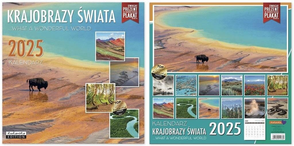 Kalendarz 2025 Krajobrazy Świata Kwadratowy kalendarz ścienny na rok 2025 z serii "Krajobrazy Świata". Każdy miesiąc cieszy pięknym zdjęciem, które będzie wspaniałą ozdobą Waszego domu. Kalendarz po rozłożeniu ma wymiary 30x60 cm - górny kwadrat wypełnia zdjęcie, a dolny kalendarium. PREZENT: w środku kalendarza znajdziecie plakat o wielkości 30x 60 cm! Specyfikacja: Wielkość: 30 x 30 cm (po rozłożeniu 30 x 60 cm) Gratis: plakat Styl: nowoczesny, klasyczny, zdjęciowy
