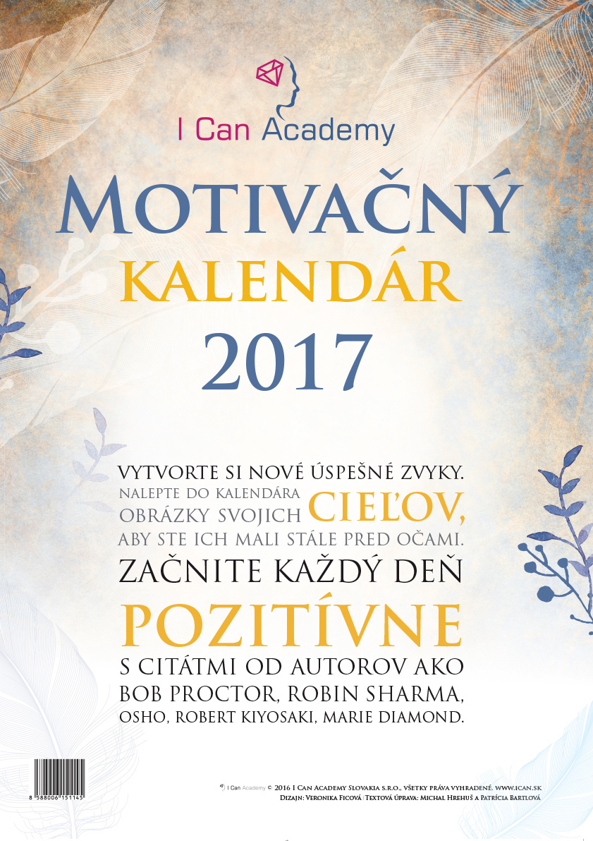 Vytvorte si príjemné, podporné prostredie s nástenným motivačným kalendárom. I Can Academy Motivačný kalendár 2017 vám pomôže: *každý mesiac zamerať pozornosť na svoj cieľ. *vytvoriť si nové úspešné zvyky, *poslúži vám ako nástenka vízií, na ktorú si môžete každý mesiac nalepiť obrázok vášho cieľa, *inšpiruje vás viac ako 85 najlepšími citátmi o šťastí, živote, vzťahoch, úspechu a cieľoch Nájdete v ňom: *každý mesiac nové citáty. *citáty usporiadané podľa tém a tak, aby nielen samotné, ale aj spolu dávali ešte väčší zmysel. *miesto na sledovanie vašich nových úspešných zvykov. *miesto, kde si napíšete cieľ na každý mesiac. *priestor na obrázok vášho cieľa. *kalendár menín. *12 dizajnov - nový dizajn a nové citáty každý mesiac.