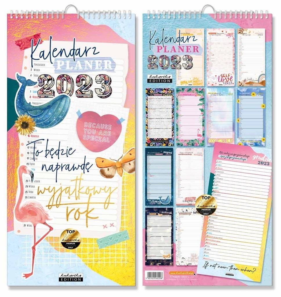 Podłużny kalendarz ścienny na rok 2023. Każdy miesiąc cieszy pięknym zdjęciem anioła i pozytywnym przesłaniem. Kalendarz będzie wspaniałą ozdobą Waszego domu. Planer pozwoli być na bieżąco ze wszystkimi zajęciami każdego członka rodziny (podział na 4 osoby) - wszystkie treningi piłkarskie, zajęcia językowe, balety, urodziny, wspólne wyjazdy - nic Cię już nie zaskoczy :) FAKTY: Wielkość: 21 x 45 cm Kalendarium: można po nim pisać Styl: cytaty, nowoczesny, klasyczny, zdjęciowy.