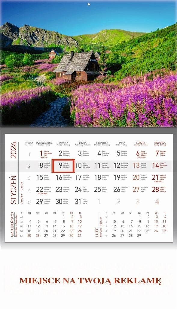 Kalendarz jednodzielny wiszący ścienny z kalendarium w układzie trzymiesięcznym z ozdobną główką, wypukłą i lakierowaną. Kalendarz jest składany do formatu A4. Istnieje możliwość zamówienia kalendarza zapakowanego w kopertę koloru kremowego. Plecki kalendarza dostępne w kolorze granatowym, zielonym, bordowym i szarym. Kalendarium ze zrywanymi kartkami. Istnieje możliwość wykonania nadruku reklamowego w dolnej części kalendarza.