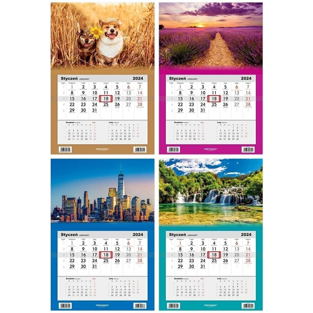 Klasyczny kalendarz jednodzielny na 2024 rok, z opaską z przesuwnym okienkiem do zaznaczenia obecnego dnia. Zawiera kalendarium miesięczne z małym podglądem poprzedniego i kolejnego miesiąca. Kalendarz jest zapakowany w folię ochronną. Sposób zawieszania - otwór w górnej części. Wymiar złożonego kalendarza to 33 x 26 cm, a rozłożonego kalendarza to 33 x 48 cm. Wyprodukowano w Polsce.