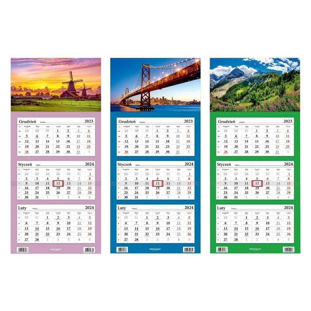 Klasyczny kalendarz trójdzielny na 2024 rok, z wypukłą główką, podłużny, z opaską z przesuwnym okienkiem do zaznaczenia obecnego dnia. Kalendarz można złożyć w 3 miejscach. Zawiera 3 odrębne, zrywane kalendaria po 12 kartek. Kalendarz jest zapakowany w folię ochronną. Sposób zawieszania - otwór w górnej części. Wymiar złożonego kalendarza to 32 x 19 cm, a rozłożonego kalendarza to 32 x 67 cm. Wyprodukowano w Polsce.