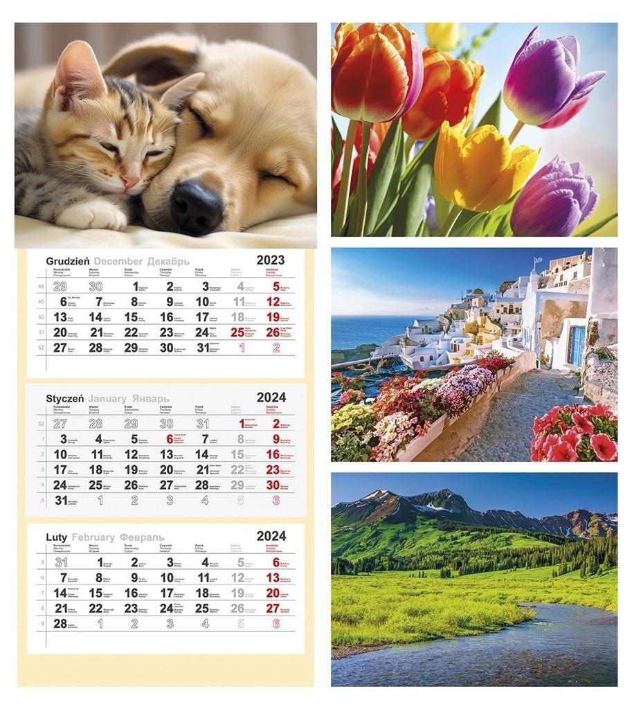 Kalendarium: język polski, angielski, ukraiński, numeracja tygodni; polskie imieninytrzy odrębne kalendaria po 12 kartek, klejony, Główka: pełen kolor 4 różnych widoków główek, Wykończenie: opaska z przesuwnym okienkiem; kalendarz składany