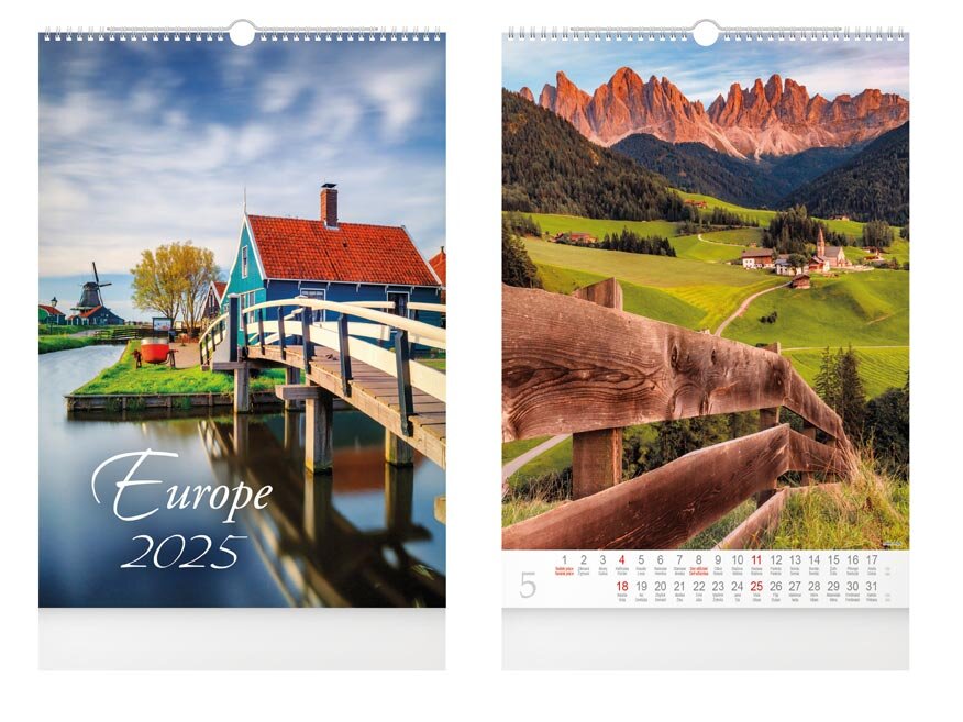 Nástěnný kalendář na rok 2025 s názvem Europe. Kochejte se fotkami krásných míst z celého Evropy a inspirujte se, kam na dovolenou. Vhodný k organizování různých událostí každodenního života. Možnost dotisku firemního loga a textu na spodní stranu kalendáře.