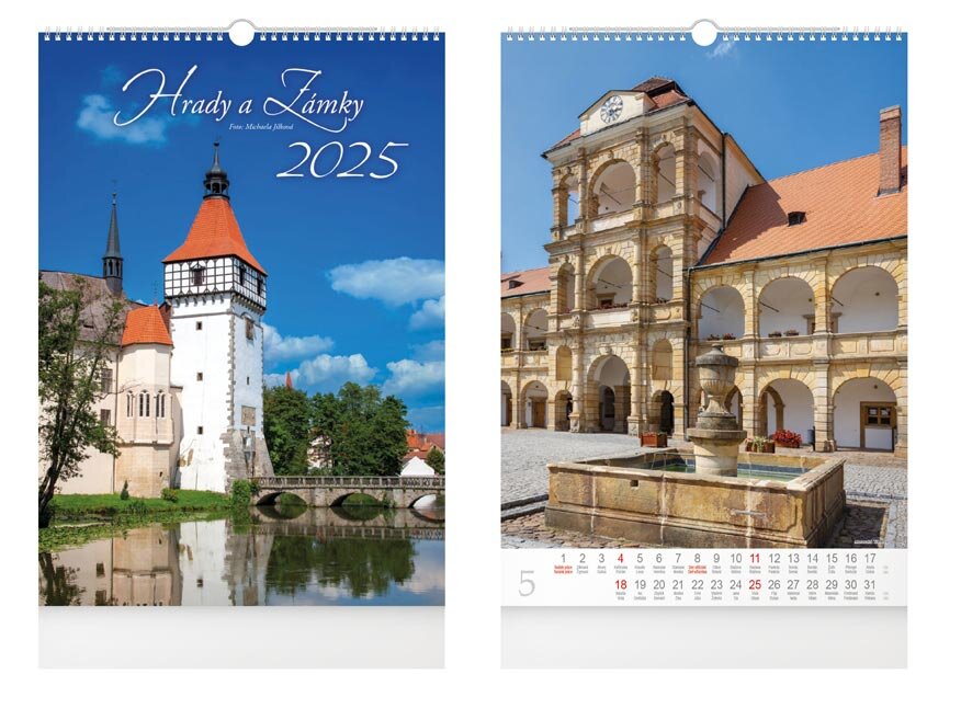 Nástěnný kalendář na rok 2025 s názvem Hrady a Zámky. Kochejte se fotkami hradů a zámků. Vhodný k organizování různých událostí každodenního života. Možnost dotisku firemního loga a textu na spodní stranu kalendáře.