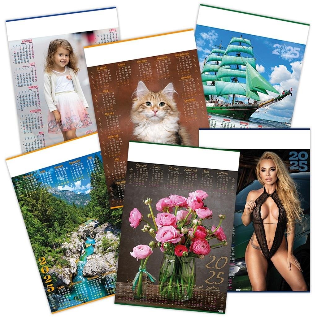 format - 670 x 980 mm objętość - 1 plansza papier - kreda 170 g/m2 druk kalendarium - 4 kolory uszlachetnianie - lakier dyspersyjny oprawa - kolorowe listwy pole pod nadruk reklamowy - 670 x 115 mm Sugerowany wymiar nadruku - 630 x 90 mm