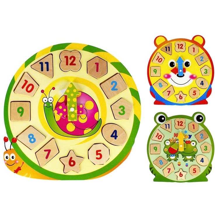 Hodiny v podobě žabky, šneka, medvídka, hodiny mají pohyblivé ručičky, aby se dítě naučilo ty správné hodiny. Čas nás provází v každém okamžiku našeho života, proto stojí za to, aby se o fungování hodinek učily naše děti už od malička. Když se naučí hodiny, minuty a vteřiny, naučí se i to, jak zůstat včas! Obsah soupravy: tabule s hodinkami. Hračka je určena pro děti ve věku 3+.
