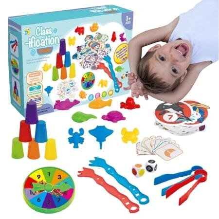 W zestawie znajduje się 6 kolorowych kubeczków, które reprezentują różne kolory zwierzątek morskich, a także 2 pary szczypców, które umożliwiają przenoszenie zwierzątek do odpowiednich kubeczków według ich koloru. Dzięki temu dziecko może ćwiczyć swoje umiejętności motoryczne i koordynację ręka-oko, jednocześnie ucząc się rozpoznawania kolorów i dopasowywania ich.