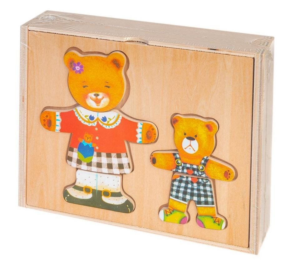 Drewniane puzzle to 2 wesołe misie do układania. Można zmienić im nastrój lub ubranie. Wszystkie elementy umieszczone są w drewnianym pudełku, co ułatwia utrzymanie zabawki w porządku po skończonej zabawie. Pudełko ma również funkcję formy na której układamy odpowiednie elementy.