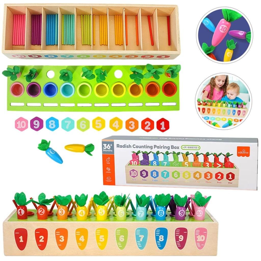 Nauka liczenia marchewki i patyczki - dopasuj cyfrę z marchewki do stojaka i włóz tyle samo patyczków do pojemniczka.