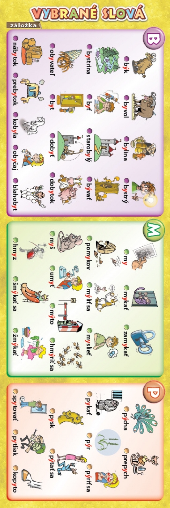 Záložka obsahuje celkom 80 vybraných slov po B, M, P, R, S, V a Z. Každé vybrané slovo je graficky znázornené. číst celé
