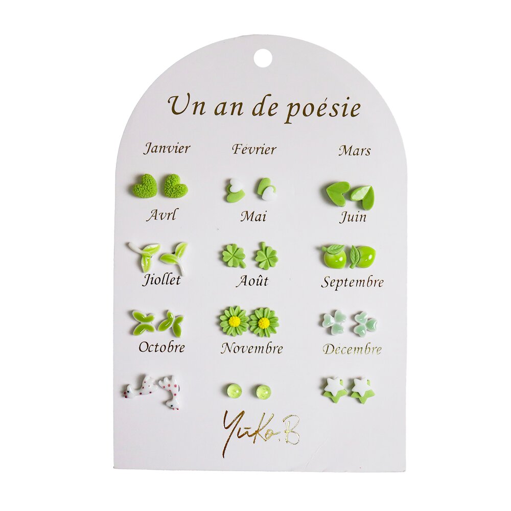 Napichovacie náušnice v zelených tónoch od francúzskej značky Yuko B. sa stanú jedinečným doplnkom pre deti i dospelých. Všetkých 12 párov náušníc nájdete v jednej darčekovej sade. Náušnice sú vhodné ako malý darček pre všetkých, ktorí milujú byť zladení do posledného detailu.
