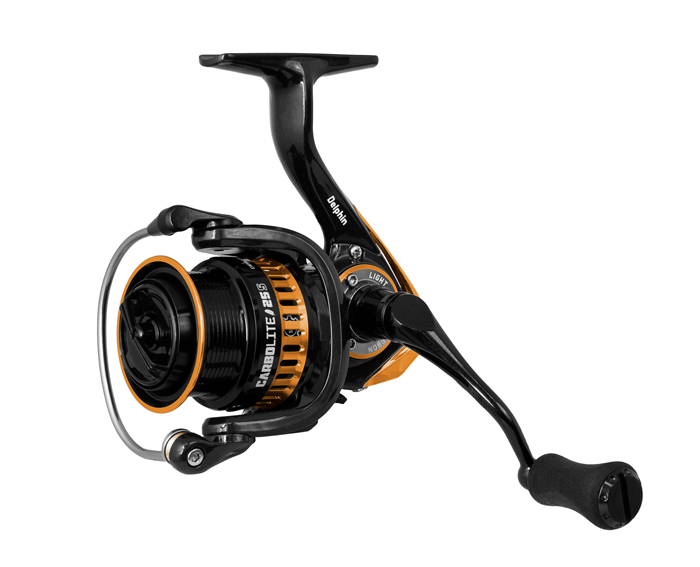 CARBOLITE je právem považován za náš top model, zejména co se týče hmotnosti a použití exkluzivních materiálů. Velikost 2500 váží neuvěřitelných 210g, což je až o 16% méně oproti srovnatelně velkému navijáku. Je zkrátka jako pírko a pokud ho zkombinujete s nějakým lehkým prutem, při celodenním lovu si ani neuvědomíte, že máte v ruce nějaké rybářské nářadí. V celokarbonovém těle se nachází přesný mechanismus, který nabízí ideální převod 5.1: 1. O hladký chod se stará 8 + 1 ložisek. Námi navržená hliníková odlehčená cívka je velmi mělká a speciální otvory se rovněž starají o značný úbytek hmotnosti. Na cívce se nachází odhozová hrana, díky které bude nahazování velmi pohodlné a přesné. Kovová klika je rovněž odlehčená a k navijáku ji připojíte pomocí vnitřního šroubu. Spojení kliky a samotného těla je tak velmi pevné a na toto spojení se můžete plně spolehnout. Madlo kliky je ideálně robustní, vyhotovené z příjemné a měkké EVA pěny. Na překlapěč jsme použili hrubý a pevný drát. Rolnička je ve zlatém vyhotovení, a i tato drobnost výborně ladí s celkovým černo-zlatým designem tohoto výjimečného navijáku, na který jsme právem hrdí. CARBOLITE je určen všem fajnšmekrům, kteří si potrpí na luxus a mají rádi odlehčené materiály, protože u vody tráví každou volnou chvíli. Klidně ho můžeme doporučit na lov v kombinaci s našimi vlajkovými přívlačovými pruty ze série UnitY.